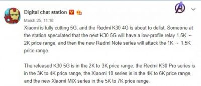 Digital Chat Station hints that Xiaomi has plans to replace its standard K30 with a budget 5G device, which will have its pricing in the range of CNY 1,000-1,500 ($140-200) and is speculated to be part of the Redmi Note line.